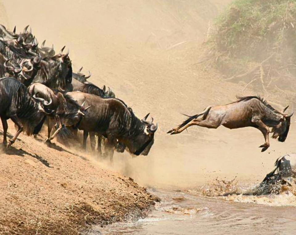 July (The Arrival): Initial crossings of the Sand River into the Mara Reserve. Grazing pressure in the south will force the herds north toward the lush, permanent waters of the Mara River.